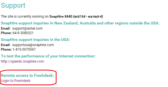"Remote access to Freshdesk" feature available directly from within the Support tab of SnapHire: